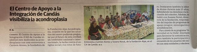 El Cai de Candás visibiliza la acondroplasia. Página 14 Diario El Comercio. Jueves 20-11-2025.