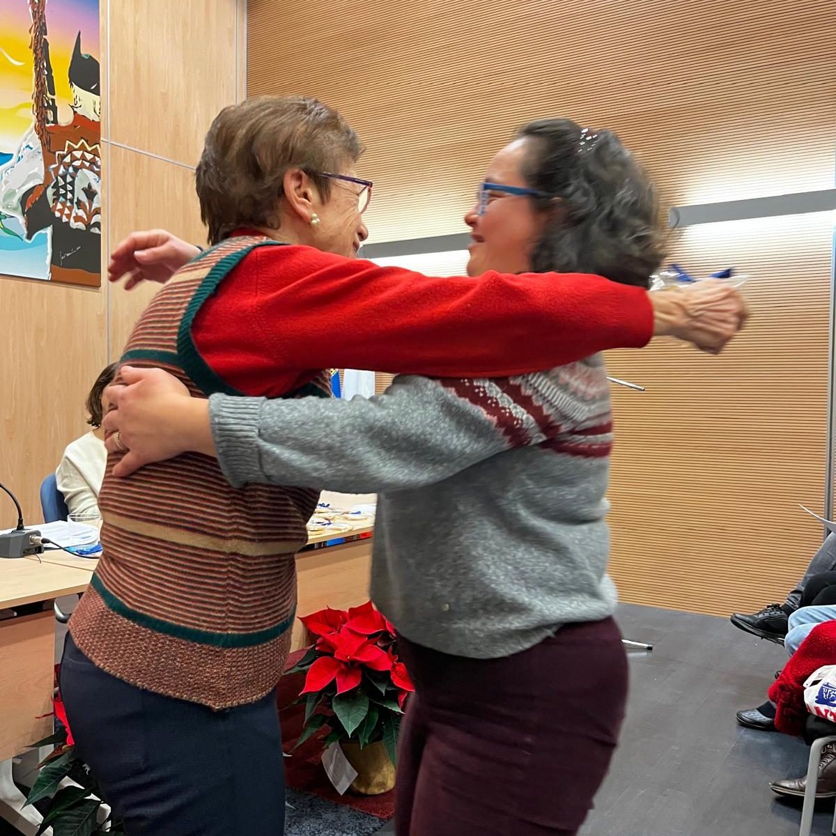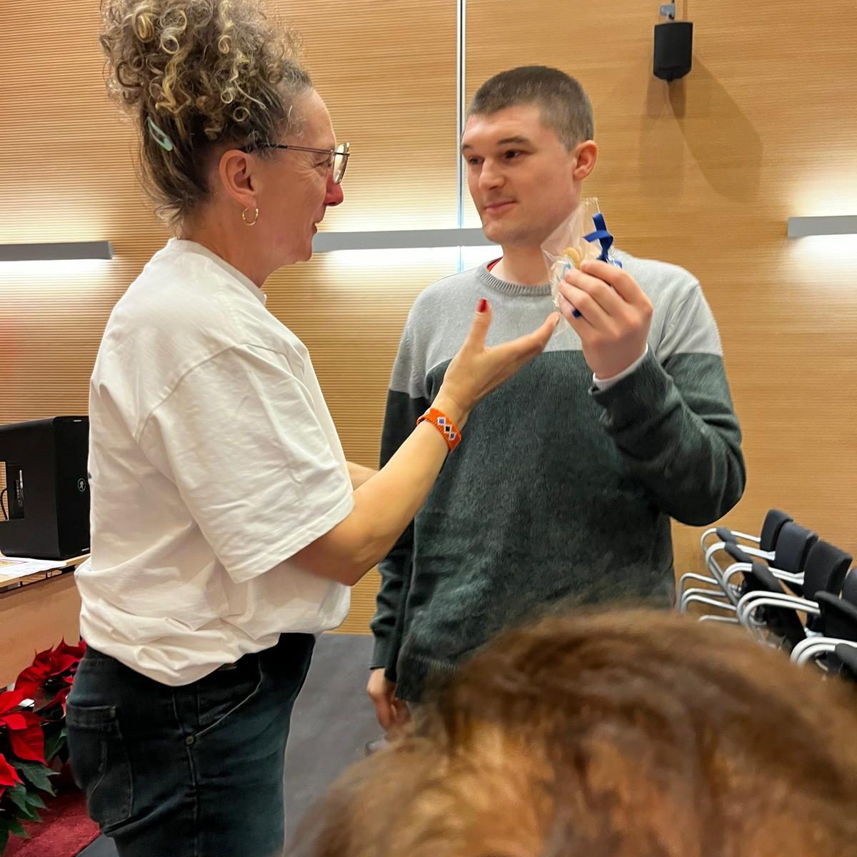 Durante esta actividad, los/as participantes recibieron una galleta-poema, elaborada por la Confitería Manzano, y compartieron dibujos que habían realizado previamente para ilustrar los poemas. Estas ilustraciones fueron entregadas a las autoridades y poetas presentes y también expuestas en el “tendal de poemas” ubicado en el hall del centro, fomentando la participación activa y el reconocimiento artístico de cada persona. AEA agasajó a cada centro participante con una flor de pascua con un poema. Flores procedentes de la artesana florista Selva Esmeralda, afincada en la parroquia de Prendes ( Carreño).